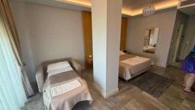 Pokoj prostorný, velký balkon s přímým výhledem na moře, klimatizace, pohodlné postele, TV, lednice, trezor a velká koupelna. Wi-Fi dostupná v celém hotelu i na pláži nebo u bazénu.