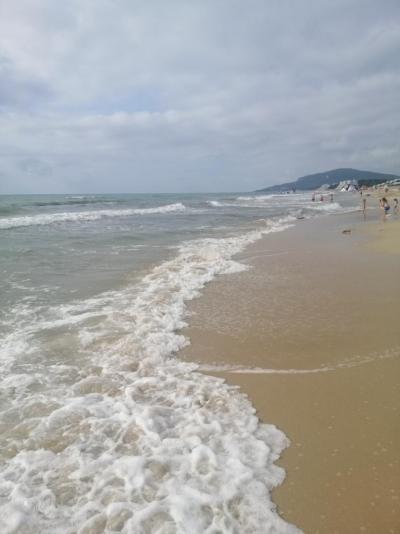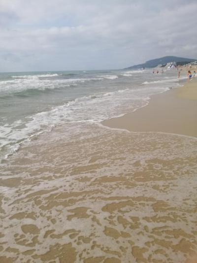 písečná pláž jen přes promenádu, moře parádní, někdy klidné jako rybník, jindy vlny, pozvolný vstup