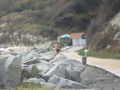 Vstup do moře byl velmi komplikovaný a hned první kroky nás přesvědčili, že není nic takové, jak to vypadá. Bylo nutno se vyhýbat tmavším místům, neboť ta předznamenávala kamenité dno, což mnozí poznali, až podle bolavých obrkaných palců na nohou. Balvany byly velké mnohdy porostlé mušlemi, tudíž ostré.
