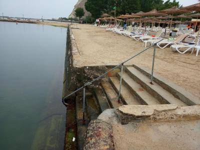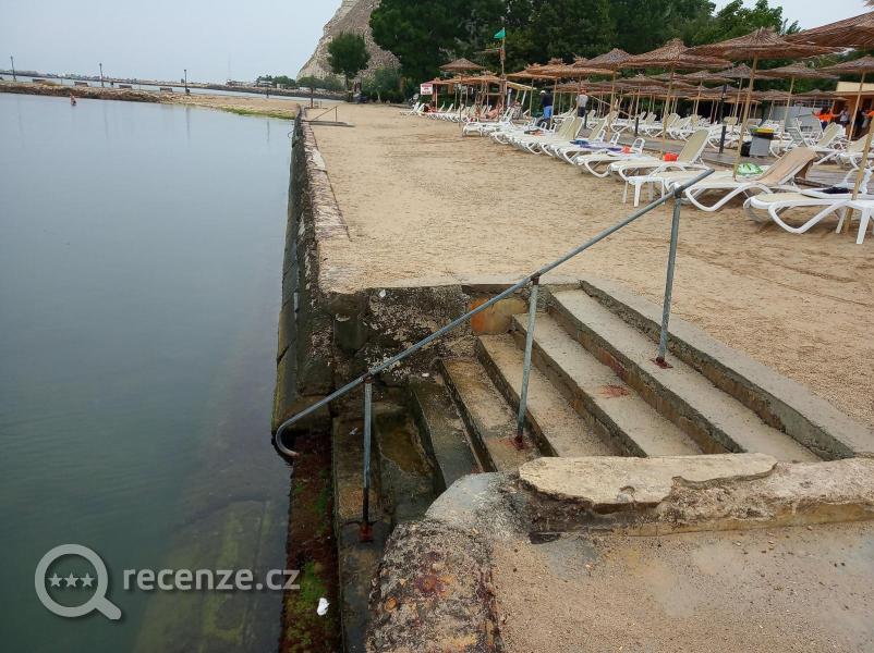 Neudržované schody, kluzké, nebezpečné a v moři balvany. Pláž špinavá, smradlavá, neudržovaná.