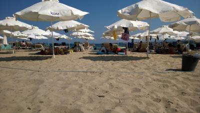 2 pláže zhruba stejně daleko (10 min pěšky) - Severní - plnější, více stánků, moře možná kapku čistější, výhled na Primorsko. Jižní - delší, výhled na čiré moře (při větru více vln, řasy).