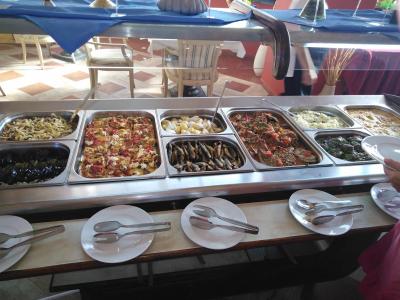 Neskutečný výběr, něco se opakovalo, něco bylo jen jednou, každopádně všechno jsme během týdne určitě ani nestačili ochutnat. Na snídani nakrájená zelenina, opečené párky, vajíčka (míchaná i vařená), obalovaný květák, různé dobré salámy, jogurt, několik druhů mysli, buchty, croissanty, pomazánka, paštika... Na oběd úžasná jídla od jehněčích kotlet, přes lasagne, špagety a těstoviny s omáčkami po řízky a pizzu, ratatouille, karbanátky nebo pečená křídla, grilovanou rybu... Nespočet příloh u nás běžně nevařených a hlavně výborné zeleninové saláty. K obědu i večeři byla polévka. Na oběd a večeři k dispozici čepované pivo, víno, jinak vždy šťávy i komerční nápoje. Jediné co mi nechutnalo, byla bramborová kaše, která byla vymíchaná asi jen s vodou. Výborné zákusky, nadýchané a nebyly přeslazené. V rámci all inclusive v barech několik míchaných nápojů, panáky, víno, pivo, káva z barového automatu nám chutnala moc.