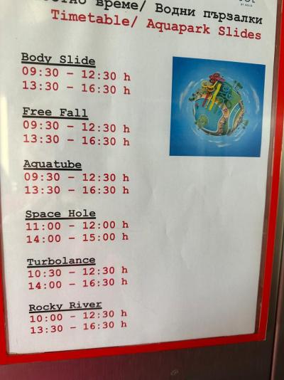 Poměrně drahé na Bulharsko. Za tu cenu čekáte více. Jídlo a pití dostatek, ale průměr. Není vhodné pro nekuřáky. Všude jsou cedule, co je zakázáno, ale není to nijak dodržováno ani vyžadováno. S úklidem si hlavu moc nelámou. Skluzavky jsou v provozu v různé časy, stejně tak i občerstvení v areálu mimo hlavní restauraci. Večer jsou moc hezké atrakce pro děti (zorbing, motokáry,...) - placené extra. Moře a pláž plné chaluh, v moři sem tam kámen, ale pomalý sestup.