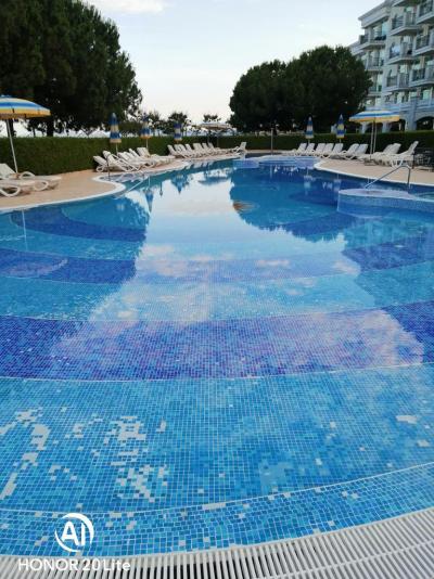 Velice příjemná dovolená pro nás dva a myslím i pro celé rodiny naše cena byla necelých 48 000 za all inclusive .Centrum Pomorie asi 3 km pěšky nebo taxi 20 leva nebo povozem s konmi.Hotel složený s několika budov je opravdu rozlehlý.K dispozici 3 venkovní bazény a jeden krytý.pozor na pláži už all incl.neplatí je veřejná a je to tam psáno.