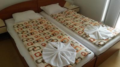 Ubytování průměrné, přijeli jsme sem hlavně za mořem. Pokojík je malý, balkonek také ale pro dva stačí. Nejhorší byl kravál a to doslova do dvou hodin v noci z pergoly mezi penziony a my měli okno přímo nad nimi. Tak to bylo asi pět nocí vkuse.Bulhaři se zřejmě dobře bavili a my měli zavřená okna dokud neusnuli.