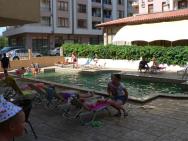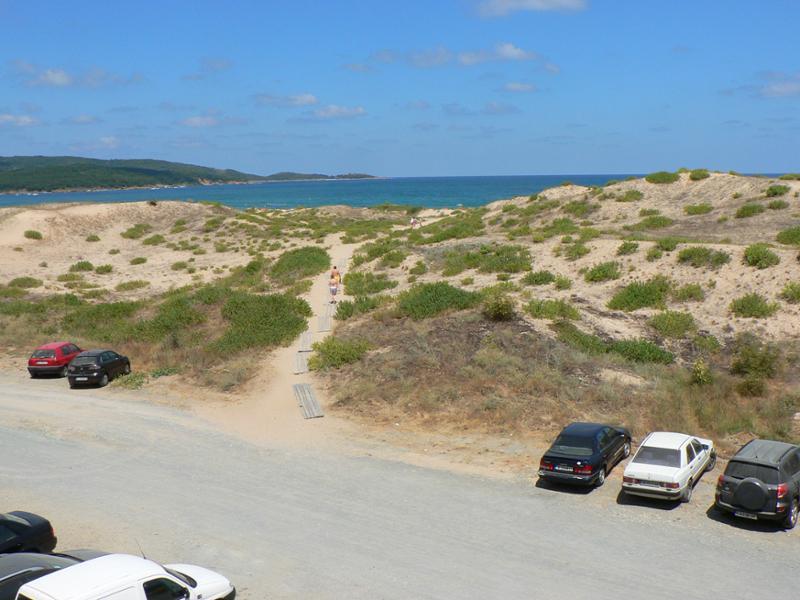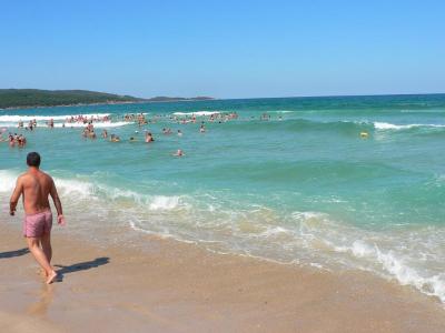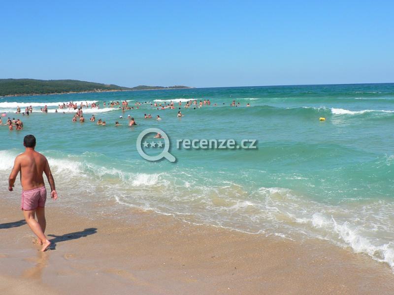 Moře bylo vzhledem k písčité pláži opravdu čisté (není to ale Jadran), teplé a bez chaluh. Od hotelu bylo na pláž opravdu kousek, a na volnou část pláže bez lehátek, bylo zapotřebí zvolit okliku asi 200 m. Pláž přímo pod hotelem byla osázená slunečníky a lehátky (6 +6 leva). Dalo se ale usadit s vlastním slunečníkem hned vedle a k moři procházet mezi lehátky. Prakticky po celou dobu pobytu byly na můj vkus velmi příjemné vlny, až na jeden den, kdy byly opravdu vysoké, pak se dal s výhodou vxužít hotelový bazén.