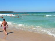 Plavčíci vytyčili bójemi oblast koupání, nejen do moře, ale i po stranách cca 50 m na šířku a každého, kdo vstoupil do moře mimo ni, nekompromisně hnali ven, nebo do vymezeného prostoru, kde občas nebylo k hnutí. Samotnému se mi ale nejevil rozdíl v případném nebezpečí utonutí. Navíc sestup do moře je povlovný a tak i 20 - 50 m od břehu bylo stále do jednoho metru vody. Nabyl jsem dojmu, že si plavčíci spíše tak usnadňují dohled nad koupajícími se. Zašel jsem i na jižní pláž (asi 15 min. chůze), která je v závětří, sestup do moře je ještě mírnější, vlny menší a koupat se tam v klidu dá.