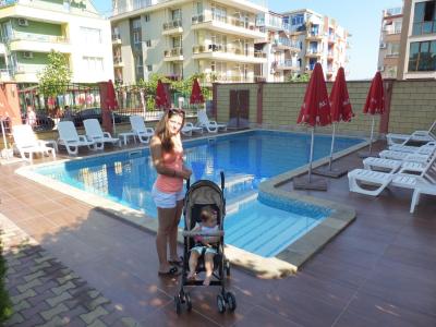 Hotel má 4 patra, je zde výtah. U hotelu je bazén se sprchou, lehátka a slunečníky, vše zdarma. Není klimatizace. Základní vybavení pokoje je sprchový kout, rychlovarná konvice, hrníčky, skleničky, chladnička, televizor, balkon. Pokoj č.25 má docela malý balkon. Na balkoně je rozkládací sušák.