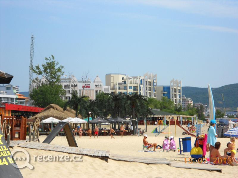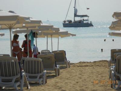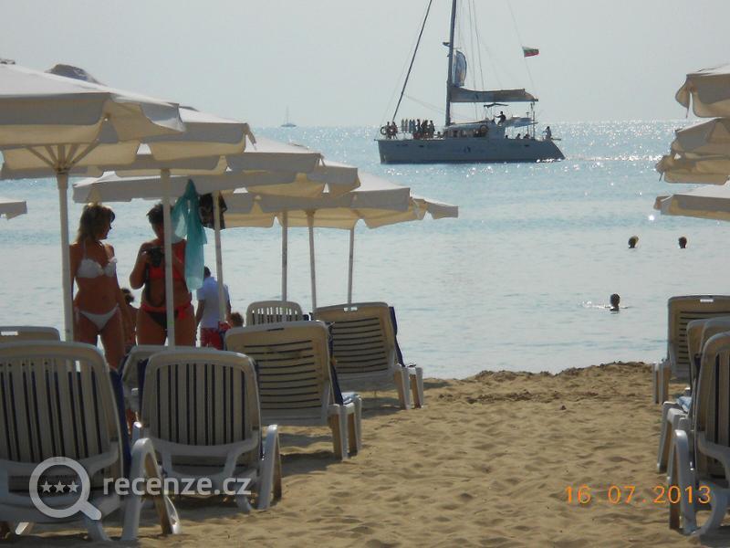 K moři to bylo asi pět minut. Pláž byla celkem čistá, jen se tam občas povalovaly vajgly. My jsme na pláž chodili ráno po osmé a bylo tam celkem prázdno. v klidu jsme si vybrali místo. Lehátka byla a slunečníky byly drahé (8 a 8 leva za kus). Ale za těmi se leželo taky dobře. Vstup do moře byl postupný, takže dcera tam byla i sama. Občas se u břehu objevily řasy, ale moc jich nebylo. Moře bylo jinak čisté a teplé. Je tam výběr vodních sportů dostatek. Jen záleží, kolik máte hotovosti. U bazénu jsou lehátka slunečníky zdarma. Ale musíte si je zajistit hned ráno ručníkem, protože později jsou všechna obsazená. U bazénu je čisto.