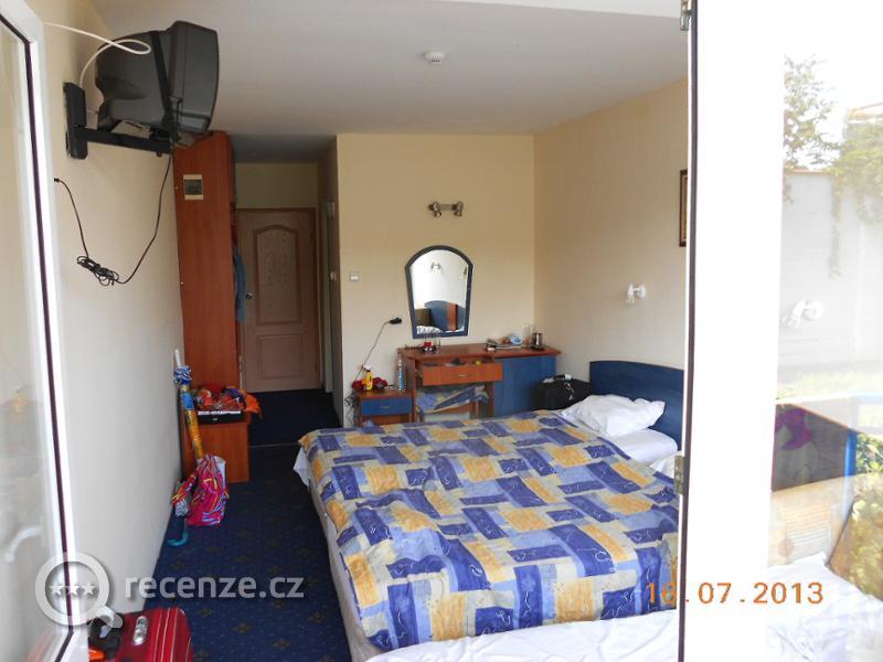 Hotel odpovídal třem hvězdičkám. Pokoj bych jednoduchý, ale na přespání úplně stačil. Přesunuli jsme si postele, abychom se přes přistýlku dostali na balkon. Pokoj jsme měli promo v přízemí s výhledem na trávu a bílou zeď. Ta ale nevadila, protože nás chránila před pohledy kolemjdoucích a hlukem. Že se někde odlepovalo kousek tapety, nevidíme jako problém. Jídelna a vše v hotelu bylo čisté.