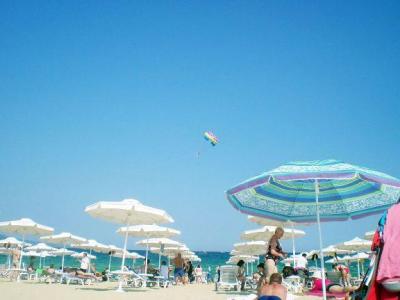 Bylo vzdáleno asi cca 0 m od hotelu..Ale bylo to kousek, cca 5 min cesty.. Pěkná velká písečná pláž. Slunečníky a lehátka za poplatek. Dalo se ležet za vyhrazenou značkou, pokud klienti nechtěli plati. Malá nevýhoda byla načasování bouřky zároveň s příjezdem na dovolenou. Všude po pláži leželi chaluhy. Do několika dnů byly uklizeny.