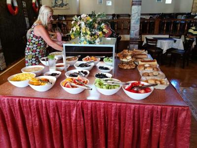 Měli jsme polopenzi. Asi největší slabina celého hotelu byla právě strava. Snídně ještě ušly, i když každý den stejné. Toustový chléb, houstičky, jeden sýr, několik salámů, šunka, marmeláda, med, vajíčka na tvrdo i míchaná. Cereálie s mlékem. Ovoce - pomeranč, grep, blumy, meloun, zelenina - okurka, rajče.Sladké = mini croissant, puding.