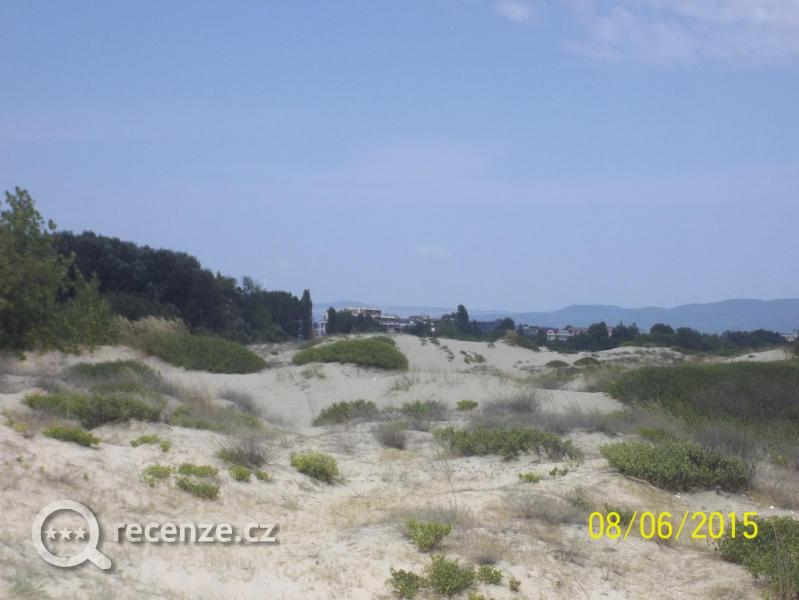 Pláž za dunami hezká,moře nádherné.Mnoho lidí,slunečníků,lehátek.Dalo se ležet i v neplacených zonách nebo za pláží u dun.Ceny za slunečník a lehátko drahé.Restaurace na pláži se srbským pivem.Když si v hotelu koupíte slunečník a lehátka musíte brzy ráno si ho obsadit,pak můžete využít bar all,který patří hotelu.Ani jsme ho nehledali a šli na lepší pivo do srbské restaurace a nápoje jsme si koupili.Po 4dnech se moře rozbouřilo,byly velké vlny,plavčíci měli dost starostí s neposlušnými lidmi.