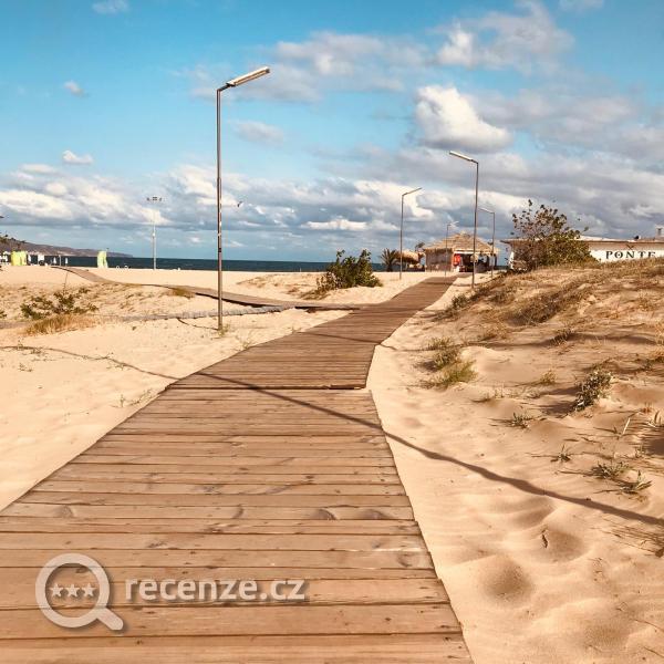 Veliká písečná pláž, moře bez medůz a řas, jen silnější vítr a velké vlny.