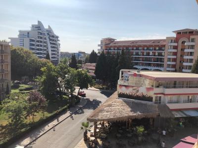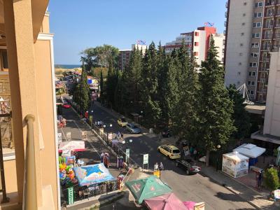 K pláži je to dle rychlosti chůze 5-10 minut, jemný písek kupodivu velmi čistý (na Bulharsko minimum vajglů), dostatečně široká a střídají se místa s lehátky a slunečníky (za poplatek 10 leva na den) a volné místa pro ostatní. Na pláži vodní sporty, výborný běh nebo procházka v písku na obě strany a vstup do moře téměř jen po písečném dně. Občas drobné mušle nebo naplavené řasy a jeden den poměrně velké množství medůz.