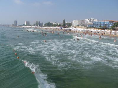pláž městská, moře půl pobytu plné chaluh, slunečníky za poplatek