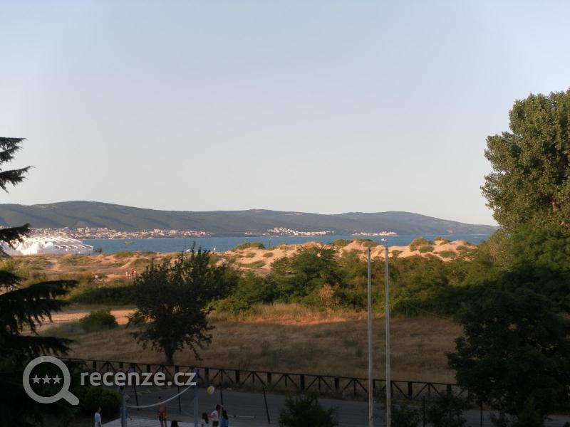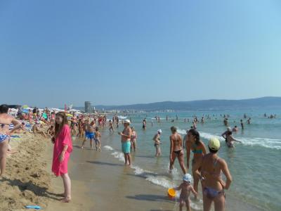Vzdálenost k moři byla přiměřená, jak je uvedeno po dřevěné lávce. Bohužel co se dá vytknout Bulharsku (aspoň podle slov delegátky), Bulhaři zrušili wc a sprchy na plážích, wc je pouze v barech, kde si musíte buď něco dát, nebo zaplatit 1 levu za wc. Navíc cena za lehátko 10 leva + deštník 10 leva na den je podle mě nehorázná... takže obvykle lehátka byla poloprázdná a všichni se mačkají ve veřejné zóně. Dopoledne koncentrace lidí asi jak na Václaváku, k moři se ani přes ručníky a deky lidí, kteří chtějí být co nejblíž moři, nemůžete ani pořádně dostat, a na pláži i v moři se mačká tolik lidí, že to vypadá až směšně. Poblíž je nějaká hala s diskotékou, takže některé zejména větrné dny tu tak duněla hudba (jestli se tomu "tucání" dá říkat hudba), že jsme radši zůstávali u bazénu. Poslední 3 dny byl u moře takový vítr, že plavčíci kvůli vlnám pouštěli jen na kraj nebo na kratší vzdálenost do moře, takže jsme si moře moc neužili. Jinak moře celkem čisté, poslední dny s vlnami připlavala i dlouhá tráva, ale to už jsme se stejně skoro nekoupali. Vodní sporty byly zde hned vedle u veřejné zóny, ale ty jsme nevyužili.