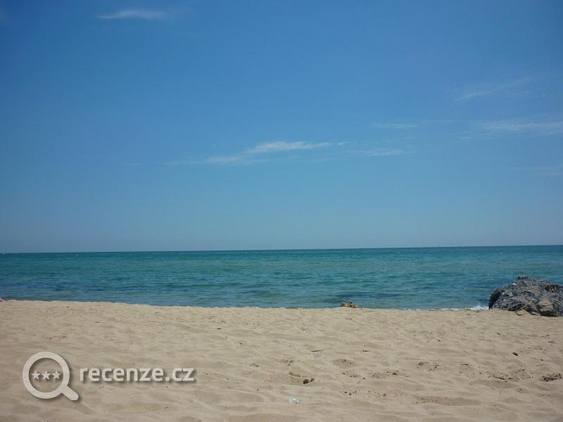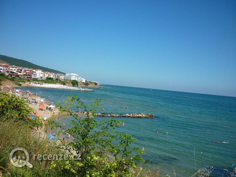 Pláž písečná, jemný bílý písek , který když zafouká máte úplně všude, ale s tím se počítá. Slunečník jsme měli vlastní, k tomu prostěradlo, osušky hotelové. Moře čisté, klidné, hlavně dopoledne,takže pokud chcete šnorchlovat-dopoledne uvidíte nejvíc, v moři to žijě -kraby, medůzy (nežahavé), rybky... U břehu malí sumečci, kteří, když se nehýbete, vám okusují nohy (klid, nemají zuby) v hotelu je mají v akváriích, kde si díky nim můžete nechat odstranit odumřelou kůži z nohou - stojí to 15 leva pro jednoho nebo 25 za pár. Moře je mělké i hodně daleko od břehu, vlny jen odpoledně když je příliv, takže o děti nemusíte mít strach, pokud umí aspoň trochu plavat. Na druhou stranu tu není plavčík takže si děti musíte ohlídat sami. Z moře je krásný výhled na celé Slunečné pobřeží i na pohoří Stará planina, které se nachází nad hotelem.