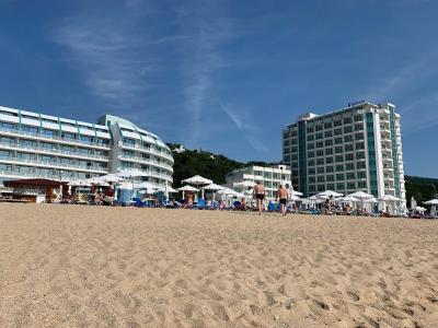 Bazény jsou dva, oba slušně velké, čisté, okolo lehátka. Jen je zavírají už v 18 hodin, což bylo zbytečně brzy. Lehátka u bazénu i na pláži zdarma. V Bulharsku začíná sezóna 30.06.. Do tohoto data, kdy tam téměř nebyli místní, bylo lehátek a slunečníku k dispozici dost. Po tomto datu už to bylo horší a po 10 hodině bylo všude plno. Takže sice zdarma, ale bylo jich málo. Naštěstí tam celkem hlídají nešvar s ručníky nechanými na lehátkách a sbírají je, čímž uvolňují kapacitu slunečníků a lehátek během dne a v noci je seberou všechny. Pláž čistá, písčitá. Pláž je přímo u hotelu, hodně rychle se ale svažuje do moře. Pro malé děti tedy nevhodná. Kousek od hotelu je za marínou malá pláž, kde část je zdarma, slunečník a dvě lehátka za poplatek 24 leva. Pláž se tam svažuje pozvolně, voda je čistší než u hotelové pláže (voda byla čistá, ale plavalo v ní dost chaluh, trávy a podobně).