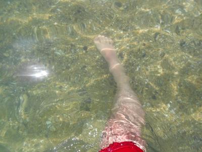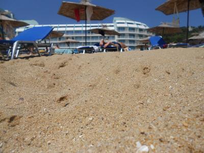 jemný písek, ,moře čistý, při přílivu hromada mušliček na sbírání. žádný potvory v moři ani medůzy. paráda.
