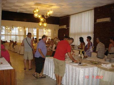 Strava kvalitní, chutná, bylo z čeho vybírat, mohlo být více ryb, nebyly v nabídce denně. Avšak, CK Kovotour plus bylo deklarováno All inclusive, což se vymykalo zvyklostem této služby. Jednalo se pod tímto názvem o plnou penzi, kdy na terase hotelu v době od 10:00 do 22:00 hodin bylo možno si sám načepovat "u otevřených dveří" jednoduchý nápoj z automatu, pivo, víno, rákiji nevalné kvality a zápachu. Pokud někdo chtěl kávu nebo čaj musel o to přes dveře požádat tzv. obsluhu, která byla charakteristická svou leností a neochotou vstát ze židle. Odpolední snack = jedno balení chipsů, křupek a tyčinek do tří misek ležících na stole vedle vyčepního automatu pro asi 200 klientů!