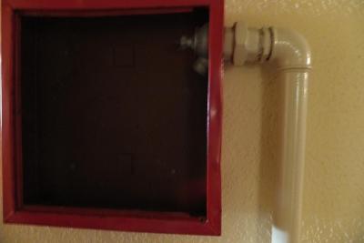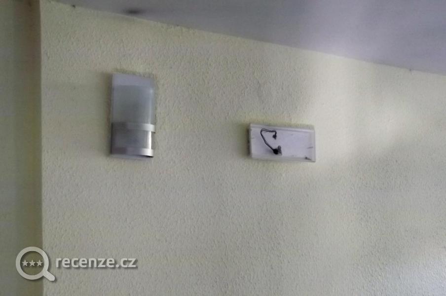 Elektrická zásuvka vytržená ze zdi, stolní lampa bez stínítka, jen se žárovkou. Zásuvky jsou v naprosto nemyslné výšce více jak 1,2 m nad podlahou. Rozvod elektřiny je vyřešen prodlužovačkou, se třemi zásuvkami na stolku.