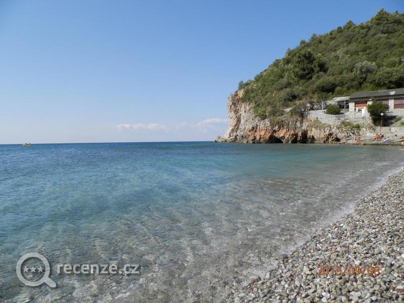 Zátoka je to nádherná, pláž je oblázková, nechodí se po ní příliš dobře. Ale do moře se dá chodit bez obuvi, není nutná. Moře je krásně čisté/ my jsme chytli trochu rozmarné počasí, byly často velké vlny/, vstup není pozvolný, je dost brzy hloubka, neplavci se tu moc nevykoupou. Navíc se velmi špatně leze z vody, v celé zátoce je takový terénní zlom. Pláž je ještě hodně naturální, nalevo od hotelu až trochu divoká, je tam také camp využívaný místními. Možnosti vodních sportů jsem si nevšimla, lehátka a slunečníky jsou přímo před hotelem za poplatek, ale třeba hned vedle jsme za plastová lehátka neplatili. Jinak souhlasím s recenzentem, který uvedl, že moře už nemůže být hotelu blíže... a když máte pokoj k moři a zvednou se vlny, máte pocit, že vás to smete i s postelí....