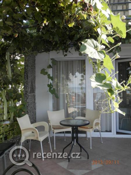 Nic luxusního, pokoje zařízené jednoduše, ale příjemně, málo úložného prostoru, malinká koupelna s toaletou. Pokoje s výhledem na moře o dvě třídy lepší. Vycházeli jsme z pokoje přímo na malou terásku, bezprostředně u moře. Na terase velmi příjemné celodenní posezení. Pokoje o patro výš s vlastní teráskou/ top pokoje hotelu/. Na pokoji televize a lednička, klimatizace.