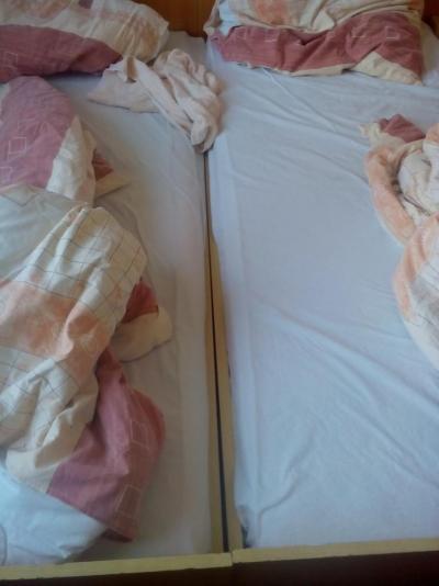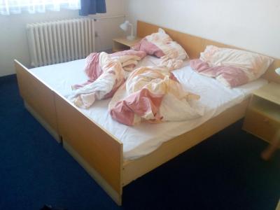 mel jsem manzelskou postel :-D .Mezi postelemi mezera od toho jak byly k sobe postele prisunute.Vybaveni odpovida 80.letum minuleho stoleti.Hotelova restaurace funguje jenom do 19 hodin a so+ne je zavreno