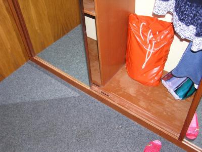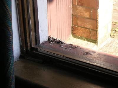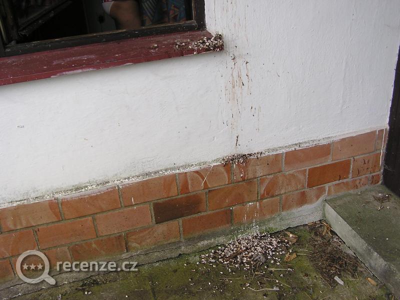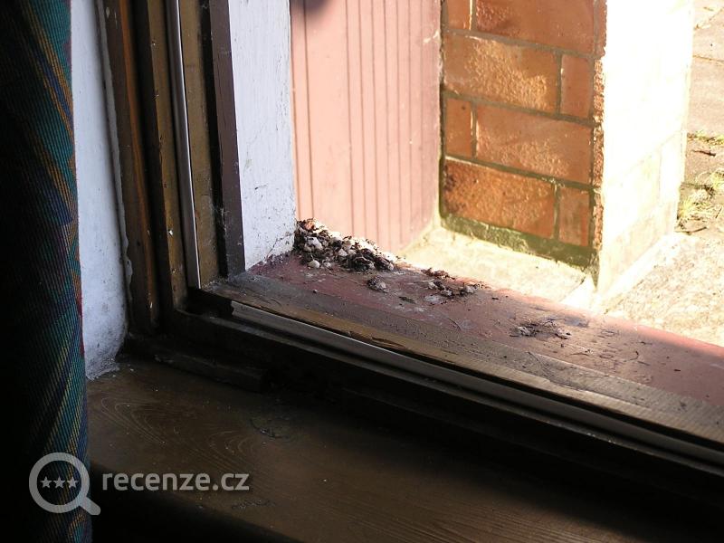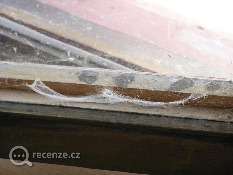 dojem při příjezdu – půjčená chata, na níž v posledních 10 letech nikdo nebyl – dřevěná paneláková okna, která měla být vyměněna už před 10-15 lety, mezi skly pavučiny (obr. č. 1), některá okna nešlo otevřít, na venkovním parapetním plechu a pod ním hromada ptačího trusu (obr. č. 2, 3), nedostatečně uklizeno, posuvné dveře skříně nešlo posunout (obr. č. 4), v ložnicích značně opotřebený nábytek „co dům dal“, v koupelně ze 6ti žárovek svítila pouze jedna (obr. č. 5), orezavělé zrcadlo (obr. č. 6), které mělo být rovněž dávno vyměněno. TV pouze 1 program (NOVA Cinema)