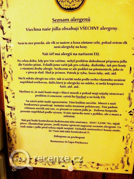 Restaurace se vyhýbá označování alergenů v potravinách. Na stěně visí na zdi oznámení, že jídla obsahují alergeny všechny. Na nástěnce je vyvěšena vývěska, která se vysmívá lidem s celiakií a podobnými problémy. Je původně z Příchovic, podepsaný je pod ní celý personál hotelu Rosa. (viz. fotogalerie)