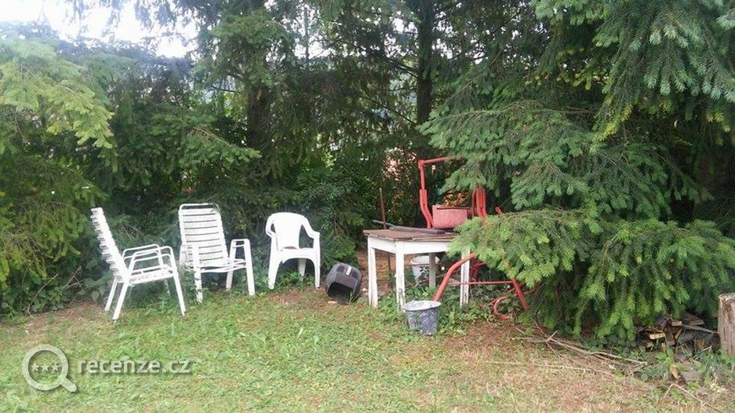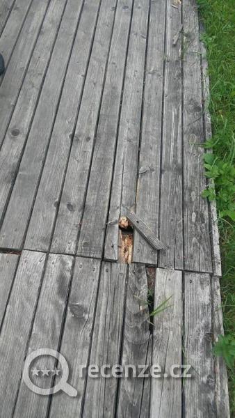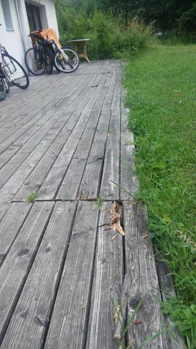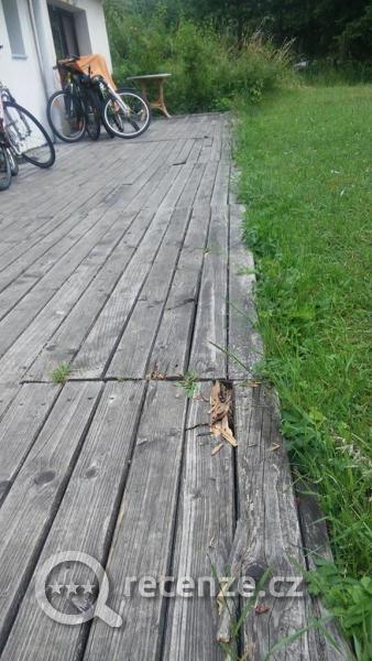 Před vstupy do pokojů je dřevěná, shnilá podlaha, která se při neopatrném našlápnutí propadá dokonce už i pod dětmi. Na zahradě je hromada starého zahradního nábytku a harampádí, tráva a křoví okolo společných prostor překáží (např. při sezení před pokojem venku). (vše na fotografiích)