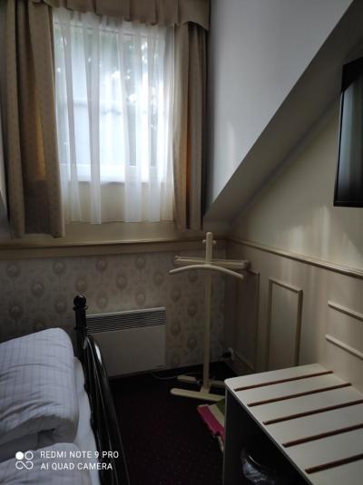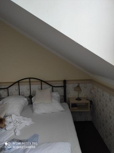 Zámek má dvě patra. Pokud budete mít smůlu a budete ve druhém, pak bacha na hlavu. Maličké pokoje, deklarovany výhled do parku leda ve snu, střešní okno s výhledem do korun stromů na opačné straně parku