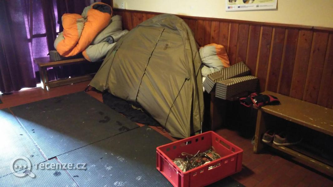 Zázemí pro stanaře je v zimních měsících nevyhovující. Je to jedna prázdná místnost, špatně vytápěná. Můžete využít společenku - tam v 15:00 bylo špinavé nádobí po večerní párty, rozházené věci, všude nadrobeno, špína. Můžete jít do sklepa do bývalé vinárny - tam je opět špinavé nádobí, šílená křesla a kočičí výkal pod pingpongovým stolem. Stany ve špatném stavu - mokré po předešlé noci, některé děravé, některé bez funkčních zipů. Spacáky špinavé (kdy se čistily naposledy?), měla by to zachránit hygienická vložka, ale ta je malá a shrnuje se.