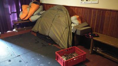 Někdo (asi správce, či řidič rolby???) nám řekl, ať si z hromady spacáků a stanů v rohu na chodbě něco vybereme, postavíme stan a jdeme spát. Jestli nám bude zima, ať jdeme do společenky a můžeme tam taky přespat (kdo by tam chtěl v tom bordelu spát???).