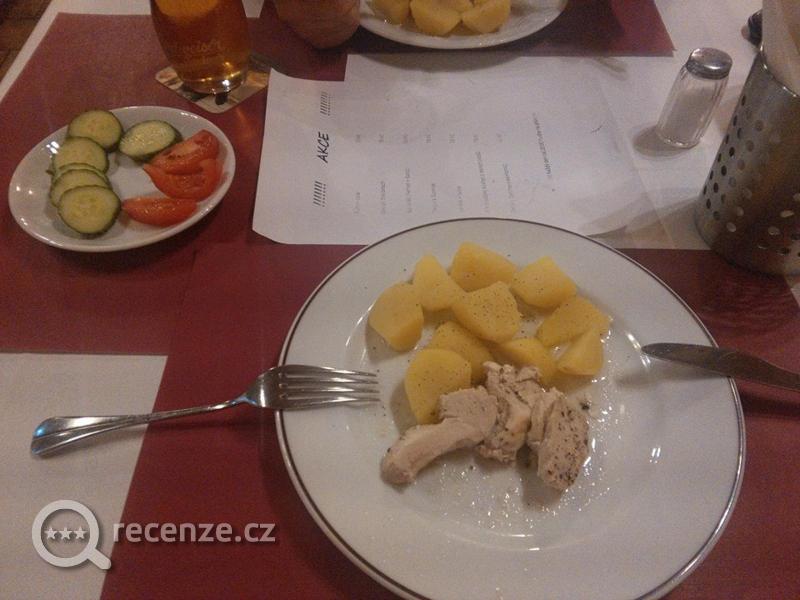 Jídlo...doma vaříme líp, příkladám foto, jak vypadala jedna večeře (na další jsme šli do restaurace U Studny - velmi doporučujeme), skleničky zapatlané, talíře také..., Na cestu místo obědu jsme dostali obědový balíček - bulka a tavený sýr, půl obloženého chleba, fruko a jablko, sušenka ( a to je ta světlejší stránka pobytu).