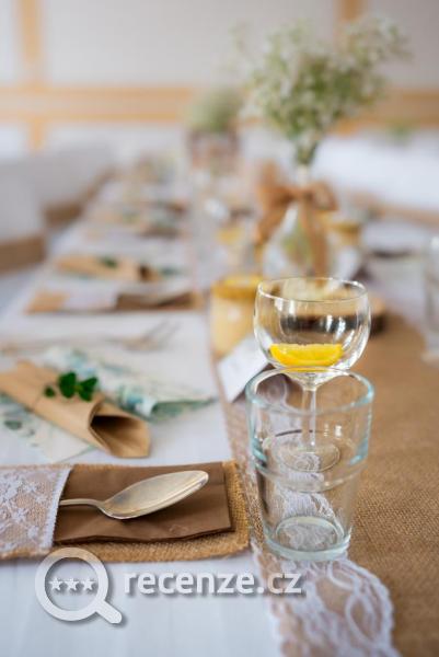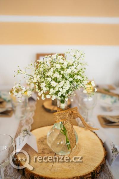 Co se táká hostiny a místa, kde byla, tak musím vyzdvihnout, že nám zařídili celé aranžmá sálu včetně květin. Toto vše jsem velmi ocenila, protože mám sama malé dítě a neměla jsem na spoustu věcí k řešení moc času. Když jsme noc před svatbou přijeli vše zkontrolovat, byli jsme naprosto nadšení, jak krásně nám sál vyzdobili. Přikládám foto. Jídlo bylo moc dobré, ale ještě víc jsme byli nadšení rautem.