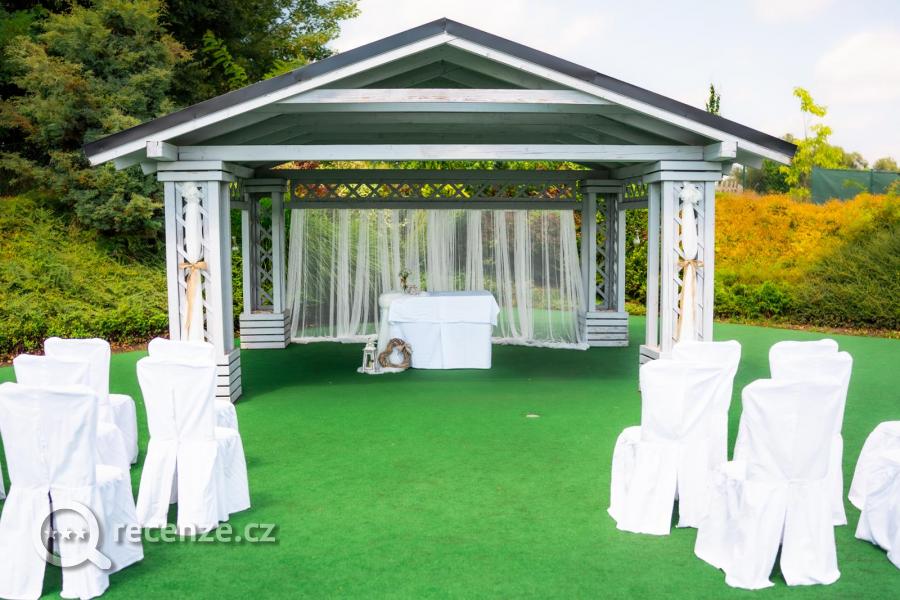 Obřadní místo mají moc hezky udělané s možností se schovat před sluncem i deštěm. V případě děstě nám nabídli pro hosty postavit stan, což jsem velmi oceňovala. Naštěstí nám ale nepršelo, spíš bylo opravdu horko. Výhled z obřadního místa byl krásný! Z jedné strany stromy a lesík, z části rozlehlá louka za hotelem a z části výhled na Petrovice.