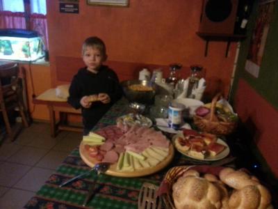 Snídaně byly chudé, množství pro celý penzion neodpovídalo. U večeře byl pouze výběr z jednoho jídla a porce byly opravdu malé. Silvestrovský raut byl téměř stejný jako snídaně. Obědy nebyli v ceně, ale pokud jsme si chtěli objednat, tak pouze výběr ze dvou jídel a pokud jsme chtěli jídlo z jídelního lístku, tak možnost pouze po 16. hodině. Když jsme si objednali bramborovou kaši pro dítě, tak řekl, že jen v rámci celého jídla a pokud se nám to nelíbí, že máme navštívit jiný hotel. Jídelní lístek jsme dostali pouze dvakrát za celý pobyt. A to před penzionem byla cedule jaký mají jídla, které ve skutečnosti neměli. V silvestrovském balíčku nebyl ani přípitek, takže jsme si museli každý koupit své šampaňské.