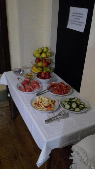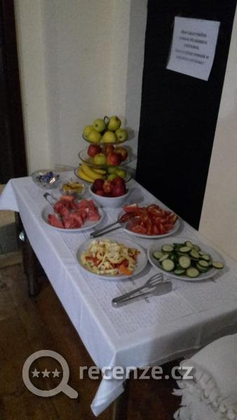 Snídaně formou bufetu...pečivo normální i cereální, cereálie, jogurty, párečky, vaječinka, opečená slanina (!!!), čaj, káva, pravé džusy (100% pomerančové a jablečné, díval jsem se jak je pravidelně dolévali), šunka kuřecí, vepřová, debrecínka, slanina, 3 druhy sýra, zeleninové mísy, ovoce, čokoládové zákusky, vánočka, bábovka. No luxus mňamy mňamy. Jako v tom nejlepším hotelu. Na večeři výběr ze 3 jídel a i 15 minut před koncem podávání měli vše. Porce že se nedaly sníst (funěli jsme pak ještě asi hodinu), vynikající jídlo, dochucené, perfektní, i Pohlreich by určitě mlaskal a chválil. Prostě úžasné. Doporučuji točenou limonádu ZON, která se vyrábí přímo v Třebíči.
