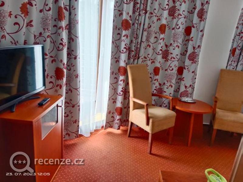 Pokoj neodpovídal tomu co uvádějí na stránkách hotelu , nábytek.Křesla tak úzké , že to tlačilo do stehen, po celou dobu týdenního pobytu sezení na postelí, záclony sem tam špinavé, postele dost tvrdé , koupelna vana a to byl taky problém u starších , a co navíc objevil se ŠVÁB naštěstí pro nás poslední večer . Na terase balkonu plastové křesla do kterých se nedalo usednout , byly tak vyšisované sluncem že opravdu špinili oblečení a dávno už měly být vyřazené.
