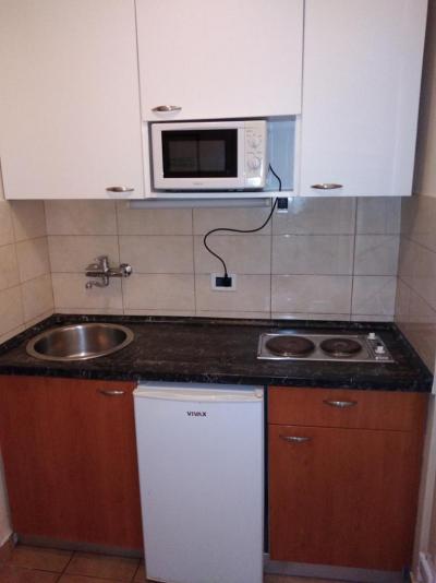 V kuchyňce chybí varná konvice a hrnky na větší kávu nebo čaj. Jsou tam jen malinké šálky. Talířů, hrnců a příborů dostatek. Je tam jen chladnička bez mrazáku. To je škoda, koupit si nanuky na pokoj by bylo super.