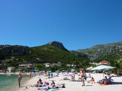 Uměle vytvořená menší pláž s navezeným štěrkem s dost ostrými kamínky. Moře krásně čisté.