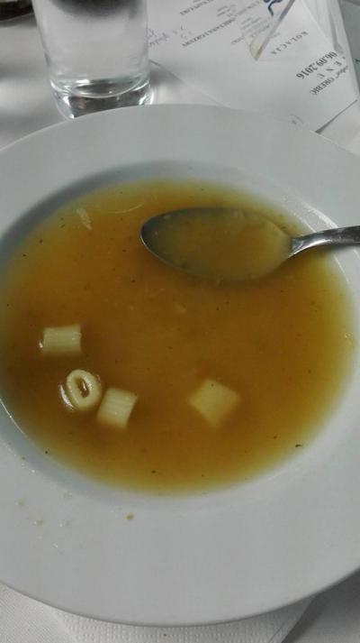 Večeře poskládaná z polévky, která byla tvořená z bujonu a vody + hlavní jídlo + dezert.