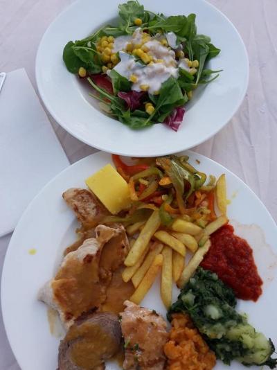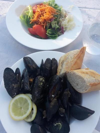 Na večeře mušle-slávky, tykří krevety, barbecue žebírka, těstoviny, pizza, různé ryby (i losos, tuňák...), kalamáry, různá masa, paella, risotto, hranolky, polenta, rýže, brambory se špenátem, teplá zelenina, fazolky se slaninou, omáčky k masu, polévky, pršuty, sýry...... a opět ovoce, zelenina, dezerty...... No prostě spokojenost! Pití se u večeře platí.
