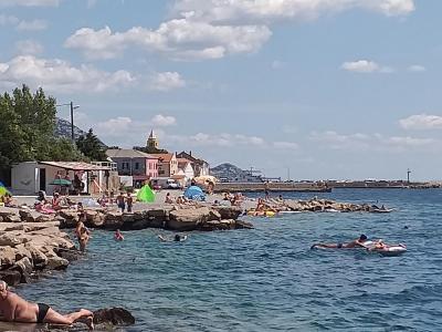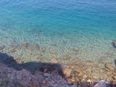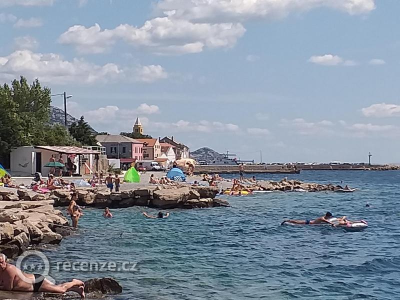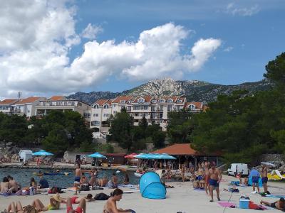 Nádherné moře, v moři vybudovaný dětský bazén s kačírkem, perfektní pro menší děti. Na pláži dostatek možností zábavy - šlapadla, kánoe, paddle boardy, potápění. Na pláži restaurace, zmrzlina, WC. Na pláž vedou schody, což je však v Chorvatsku běžné.