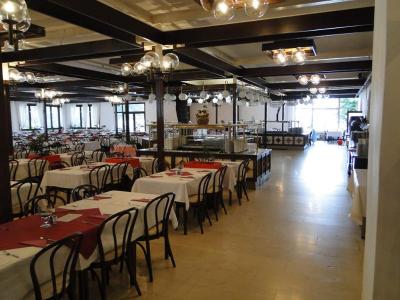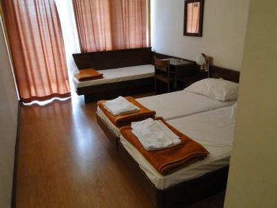 V pavilonech vedle hotelu cca 300m. Vybavení staršího provedení, ale čisté.