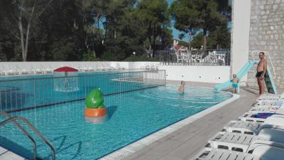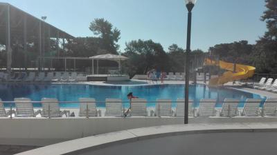 Pláž.. po příjezdu jsme čekali na pokoj, tak naše první kroky vedly tam. Pokud jdete areálem, brankou mezi bazény, je to opravdu kousíček. Pokud to obcházíte (např. ráno, protože se k brance dostanete až v těch 9:00), je to celkem dálka. Na pláži je tolik lidí, až to bylo nepříjemné, ani jednou jsme se tam nekoupali. Jednou jsme si tam za pár kun půjčili šlapadlo se skluzavkou a asi 2x jsme se tam byli projít a na zmrzlinu. Jinak jsme si autem popojeli o pár km dál na krásnou pláž, s drobnými kamínky, vhodnou pro děti a kde jsme dopoledne byli skoro sami, před polednem tak max. 50 lidí... Zde pod hotelem nebyl kam dát ručník, člověk musel přeskakovat opalující se osoby, no s dětmi nic moc zážitek.. Ale jinak je tam hodně vyžití - tobogány, bazén pro plavce se slanou vodou, nafukovací atrakce na vodě, šlapadla, podél promenády jeden obchůdek a občerstvení vedle druhého, večer se to tam mění na pouť.. Vstup do vody jak kde - někde skalnatý, někde kamínky, nicméně boty do vody doporučuji všude, ježci už pár metrů od břehu.