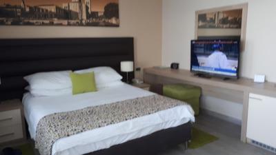 Izba bola veľmi pekne zariadená novým nábytkom. Pri objednávaní zájazdu sme si priplatili za balkón s výhľadom na more a oplatilo sa. Z našej izby sme mali priamy výhľad na more. Na balkóne sme sedávali aj ráno, aj večer a kochali sme sa úžasným romantickým výhľadom. Na izbe je veľká TV s plochou obrazovkou, malá chladnička, v skrini je trezor. Na TV sa dá chytiť česká stanica TV24 a slovenská TA3. Kúpeľňa bola tiež veľmi pekná, moderne zariadená, s fénom. V skriniach je dostatok priestoru na uloženie oblečenia a dostatok vešiakov.