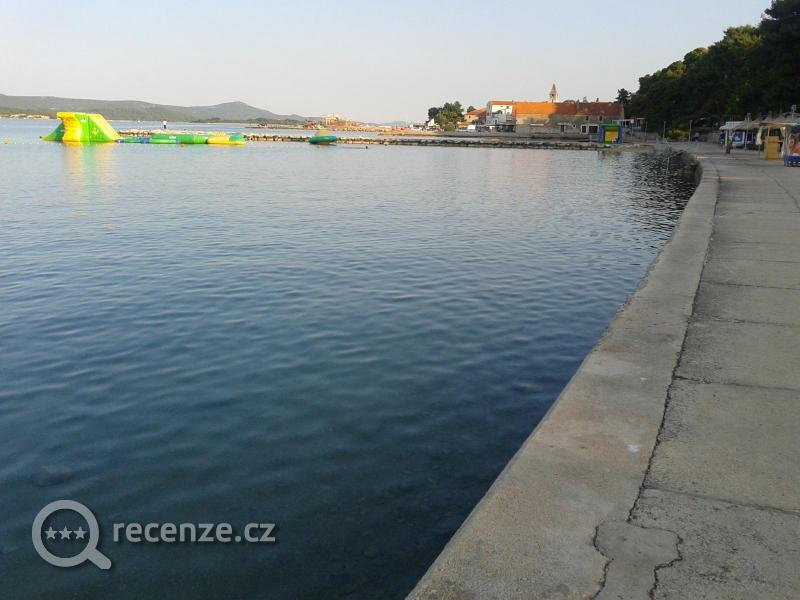 100 m od pensionu, z betonového nábřeží se po schůdkách vstoupí do moře, které bylo čisté. Dno kamenité.